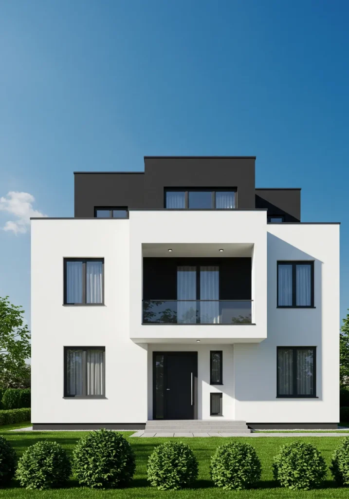This minimalist home features a bold design with a striking contrast between a crisp white facade and a sharp black top section. The clean lines and geometric shapes make it stand out while maintaining an effortlessly chic appearance. Large windows allow natural light to flood the space, giving the interior a bright, airy feel. The addition of the small balcony area adds a subtle touch of elegance, while the well-maintained lawn and shrubs perfectly frame the structure.