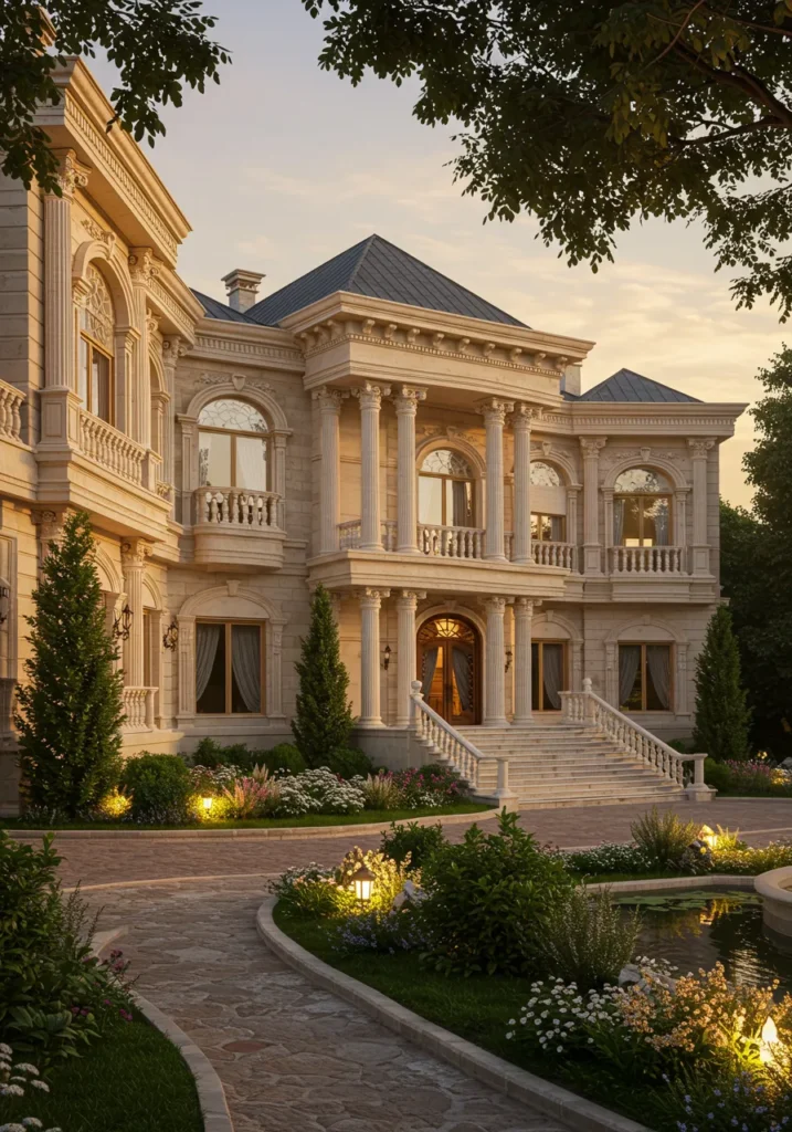This majestic mansion boasts a timeless classical design, featuring ornate stonework and large arched windows that allow light to pour into the grand interior. The towering columns and detailed balconies add to its opulence, while the symmetrical layout creates a sense of balance and refinement. The perfectly manicured garden with its winding stone path and soft lighting at the entrance enhances the luxurious feel, making this home feel like a private palace.