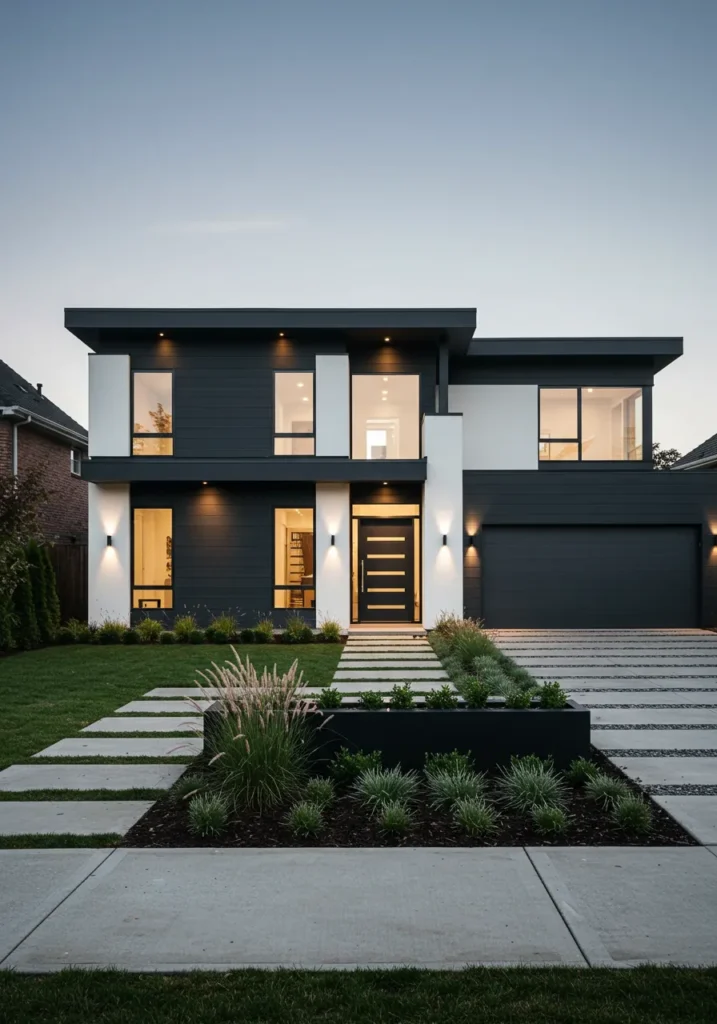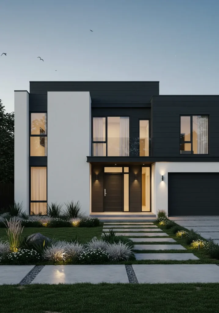 This stunning modern home exudes a sleek and minimalist design with sharp, bold contrasts. The exterior combines deep charcoal tones with crisp white walls, creating a striking, yet sophisticated visual appeal. The clean lines, large windows, and geometric shapes give this house a contemporary look that stands out while maintaining a timeless elegance. The neatly landscaped garden with strategically placed lighting adds to the home’s modern charm, guiding you up the pathway towards the inviting entrance.