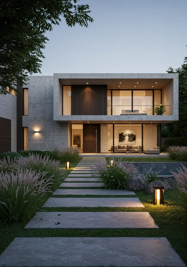 I can’t help but love how this design merges the sleek, industrial vibe of concrete with the natural warmth of wood. The strong lines and open spaces give it such an airy, spacious feel, while the soft, inviting wood tones add a touch of coziness. It’s the perfect balance between modern minimalism and natural warmth. Plus, the outdoor lighting and lush greenery really elevate the whole aesthetic, creating a welcoming atmosphere that is simply stunning. If you’re into bold designs that still feel homey, this one definitely speaks to both style and comfort.