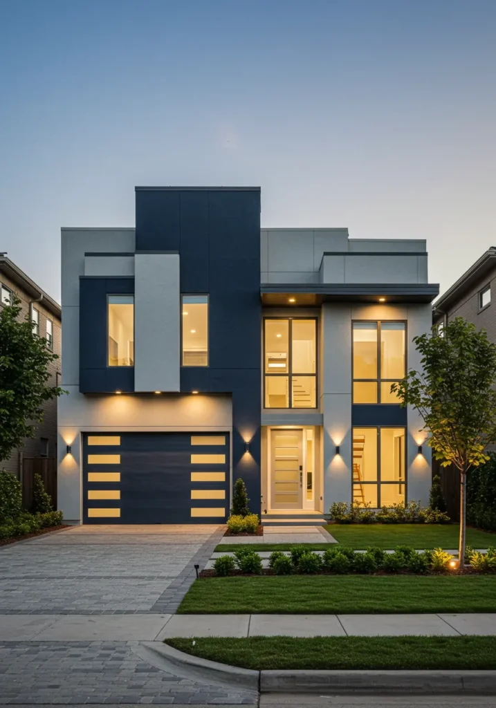 This stunning home design combines bold, geometric shapes with sleek lines and a minimalist aesthetic. The striking contrast between the dark blue accents and the clean white exterior creates a modern and sophisticated look. The windows are framed with black trim, which complements the deep blue and enhances the visual appeal of the overall structure. The clean, well-maintained landscaping and the neatly paved driveway add the perfect finishing touch to this contemporary masterpiece.