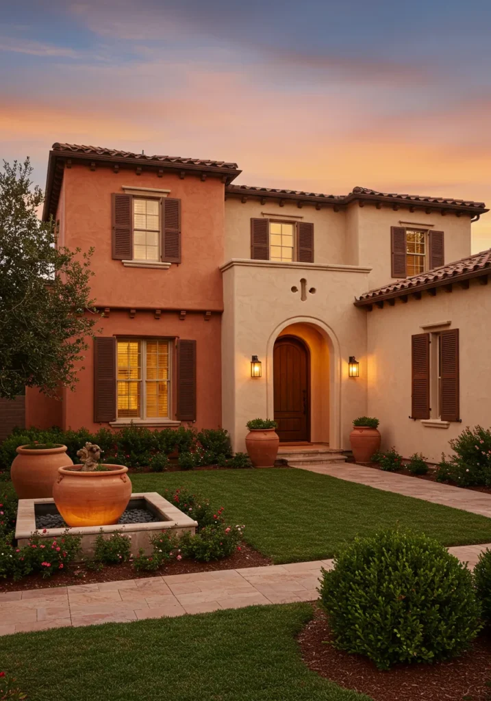 This Mediterranean-style home is absolutely captivating, featuring a beautiful blend of warm earthy tones with terracotta accents and rustic charm. The soft beige stucco exterior contrasts wonderfully with the deep brown shutters and the terracotta roof tiles, bringing the warm, sun-kissed vibes of the Mediterranean straight to your doorstep. The stone walkway leads up to an inviting arched doorway, and the large, decorative clay pots with lush greenery add a touch of life and color to the front garden.