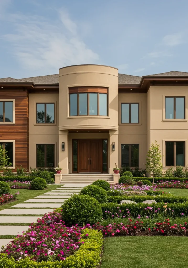 This traditional home design features an inviting, warm exterior with a beautiful blend of neutral beige and rich brown tones. The curved architectural detail above the front entrance adds a touch of class, while the dark wood front doors create an elegant focal point. The large windows allow plenty of natural light to fill the space, and the perfectly manicured garden, complete with vibrant flowers and lush greenery, creates a welcoming and charming atmosphere.