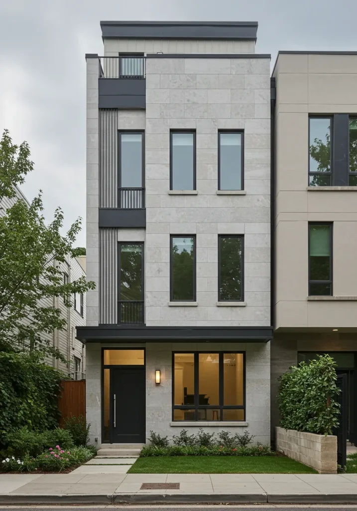 This urban modern home stands out with its stunning combination of sleek stone and expansive glass elements. The contemporary design features a light, neutral stone exterior paired with deep black accents that outline the windows and door, giving the house a sharp, clean look. The large windows and minimalistic styling highlight the openness of the space, with a modern touch that extends to the flat roof and geometric structure. Simple yet impactful landscaping complements the modern architecture, adding balance without overwhelming the design.