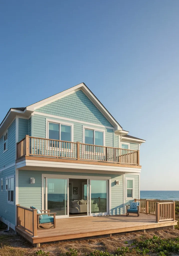 This charming beach house captures the essence of coastal living with its serene, soft blue exterior. The subtle, pastel hues of the siding evoke the calming feel of the ocean just steps away. A wide wooden deck welcomes you to the spacious outdoor living area, perfect for relaxing and enjoying the ocean breeze. The large windows allow ample natural light to flood the interior, offering an unobstructed view of the sea, while the wooden railings on the porch add a touch of rustic charm to the modern design.