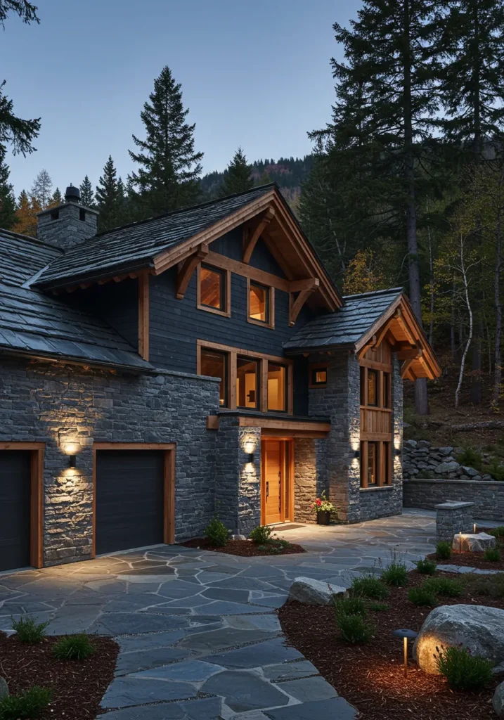 This beautiful mountain retreat combines rustic charm with modern elegance, featuring an impressive stone exterior and rich wooden accents. The dark stone walls create a grounded, natural feel while the warm wood trim and beams add a cozy touch. The steep rooflines and large windows perfectly complement the surrounding forested landscape, allowing ample natural light to flood the interior. The well-lit driveway and garden area with strategically placed landscaping create an inviting approach to the home.