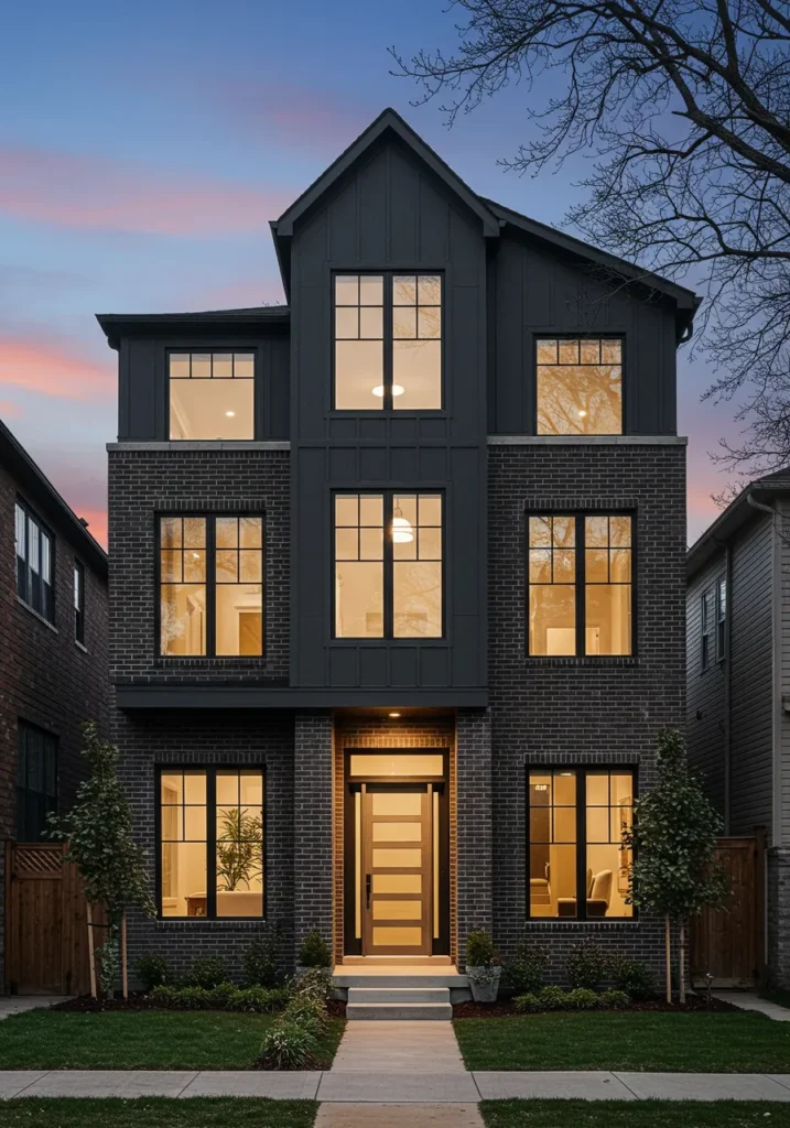 This modern three-story luxury home stands tall with sleek, dark brick exteriors and large, tall windows that let in an abundance of natural light. The clean lines of the design are beautifully complemented by the simplicity of its front entrance, where a minimalist door with horizontal panels stands as a striking focal point. The soft, warm glow from the interior lights spills out, creating a welcoming atmosphere against the cool hues of the twilight sky. The landscaping is just as thoughtfully designed, with small trees and neatly manicured lawns framing the house, adding an extra layer of elegance to the overall aesthetic.