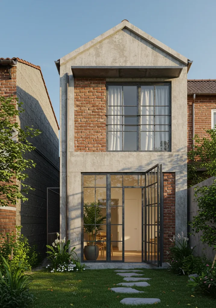 I’m absolutely in love with the edgy, industrial vibe of this design. The mix of brick and concrete gives it such a strong, architectural presence, while the large windows bring in plenty of natural light and make it feel open and airy. The simplicity of the stone pathway and greenery is just perfect, allowing the house itself to shine as the focal point. It’s a design that feels bold and modern but also welcoming, making it a perfect blend of style and comfort. This is the kind of home you can’t help but admire from every angle!