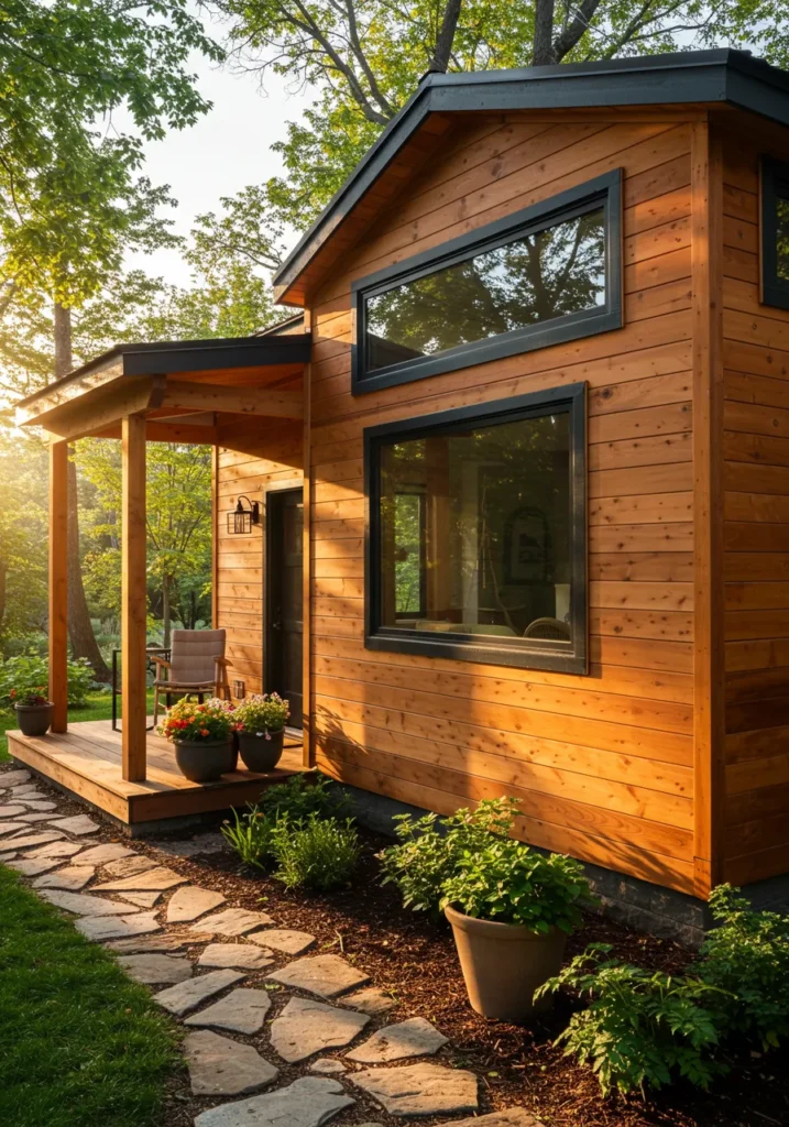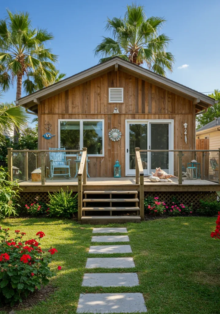 I absolutely love how this design feels so warm and inviting! The natural wood exterior gives it a rustic, almost beachy vibe that’s so charming. The pops of color from the flowers just bring it to life and give it such a welcoming feeling. Plus, the porch is absolutely perfect—just the kind of space I’d want to sip my morning coffee while soaking in the serenity. It’s the perfect combination of simple elegance and natural beauty, and it makes me wish I could step right into this lovely little home!
