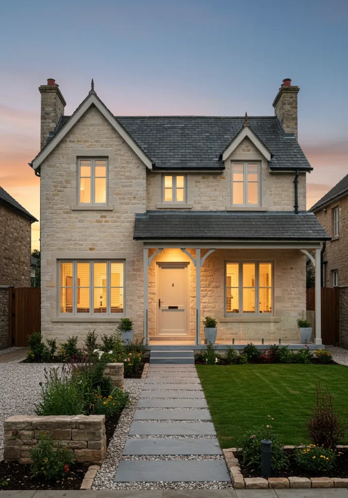 I can’t help but love how this design perfectly balances cozy charm and sophisticated elegance. The stonework creates a timeless look that feels so welcoming, yet the careful detailing, like the neat garden and the perfect roof pitch, adds just the right amount of luxury. It’s like a modern fairy tale cottage that still feels so warm and inviting. This house is not just a home, it’s a serene retreat waiting to be enjoyed every day!