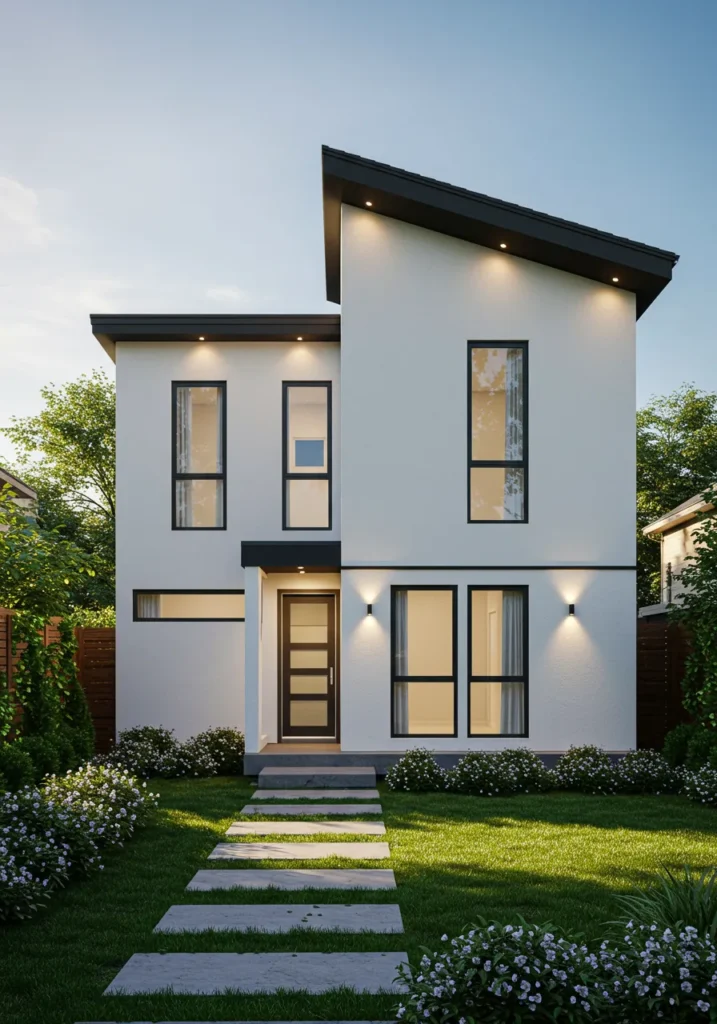 This modern home features a sleek, minimalistic design with clean lines and bold geometric angles. The contrast of dark accents and light walls creates a stunning visual impact, with large windows framing the interior beautifully. The front yard is framed by simple, symmetrical landscaping that complements the sharp design of the house. The pathway leading up to the front door is clean and inviting, with well-placed lighting highlighting the architecture as night falls.