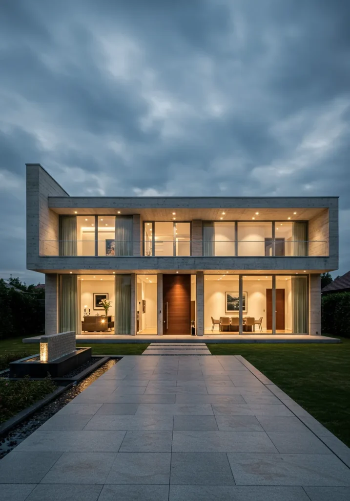 This modern home features a stunning blend of concrete and wood, with sharp lines and a minimalist design that’s both striking and sophisticated. The raw concrete exterior contrasts beautifully with the warm wood accents around the entrance, adding a touch of nature to the bold, industrial feel of the structure. The wide stone pathway, flanked by lush greenery, guides you to the inviting front door, while the soft lighting around the exterior highlights the home’s clean design, making it look even more striking as dusk settles in.