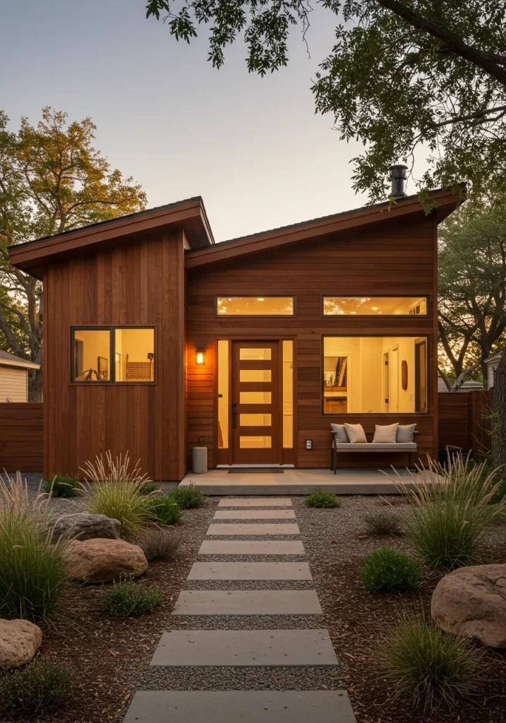 This gorgeous modern cottage features rich wooden siding paired with a sleek concrete pathway that leads right to a stylish front door. The house design combines warm, earthy tones with clean, contemporary lines, creating a cozy yet modern feel. Large windows bring the outside in, allowing natural light to flood the interior. The front yard is thoughtfully landscaped with minimalistic, natural elements like rocks and grasses, further enhancing the serene and welcoming vibe of the home.