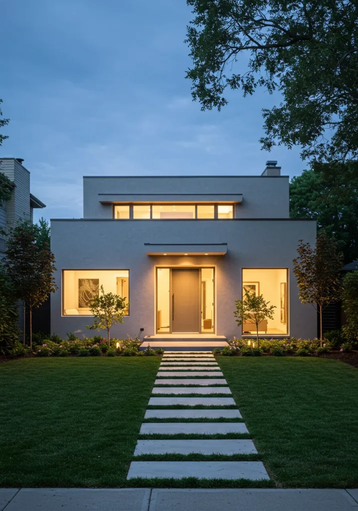 This modern house features a clean and minimalist design, with smooth stucco walls and large glass windows that seamlessly blend the indoors with the outdoors. The house’s simple, boxy shape gives it an air of contemporary sophistication, while the symmetrical windows and sharp lines add a sense of balance and order. The well-kept lawn, combined with the chic stone pathway leading up to the front door, makes this small luxury house feel both luxurious and approachable, offering an inviting glimpse into a stylish home.