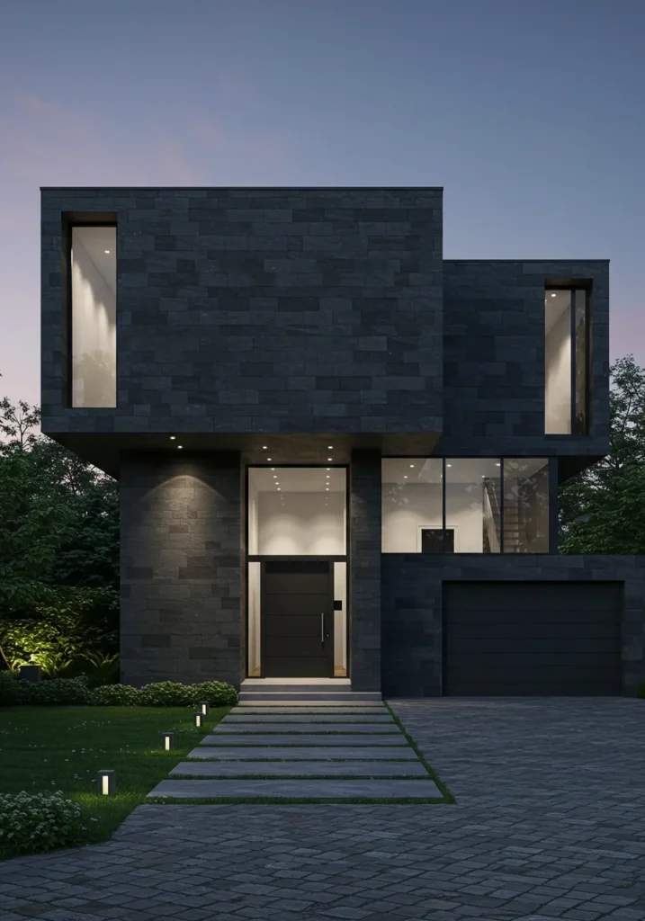 This striking modern house features an imposing dark stone facade, offering a sleek and bold appearance that’s both powerful and minimalistic. With large glass windows and a clean, geometric design, the house looks almost like a sculpture rather than a traditional home. The dramatic lighting highlights the sharp lines of the architecture, making it stand out even more as dusk falls. The front walkway is neatly framed by soft garden lighting, adding a touch of warmth and contrast to the dark exterior.