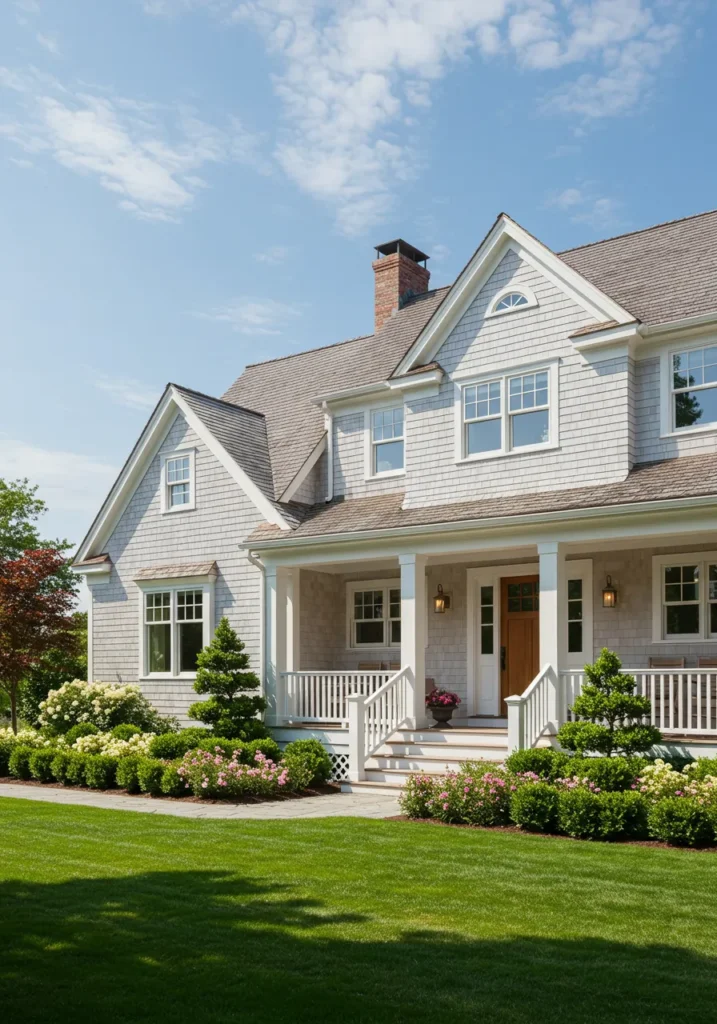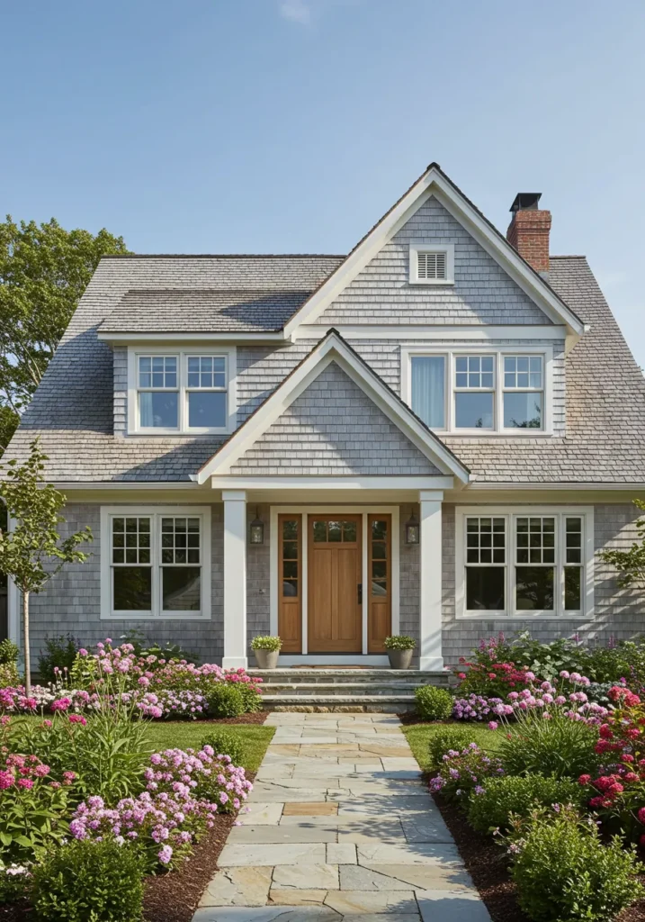 This beautiful Cape Cod home features soft gray cedar shingles paired with pristine white trim, creating a classic yet fresh look. The wide front porch, framed by elegant columns, adds to the welcoming nature of the home. The large windows allow natural light to flood the interior, while the carefully manicured landscaping with vibrant flowers and neatly trimmed bushes adds life and color to the front yard. A stone pathway guides you to the inviting front door, completing this picturesque design.
