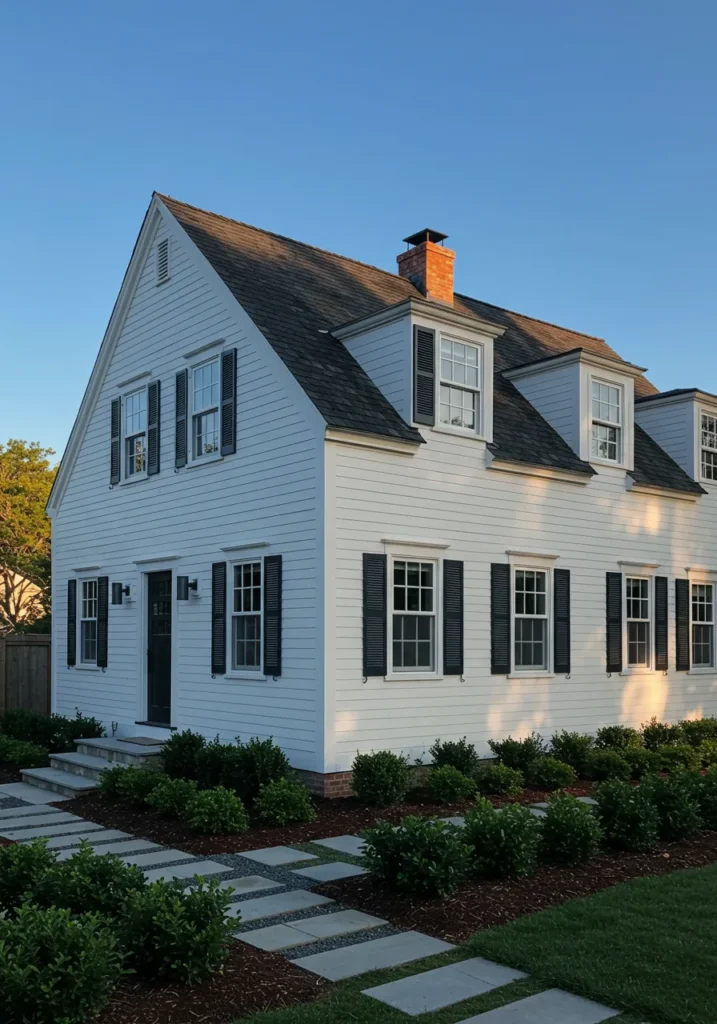 This Cape Cod house boasts a beautifully clean and classic design, featuring crisp white siding paired with rich black shutters and a bold front door. The geometric symmetry of the architecture, with its evenly spaced windows, gives it a polished and timeless look. The front pathway, made up of large stone slabs, leads to a welcoming entrance flanked by greenery, adding a touch of natural elegance. The tall, sloped roof completes the look, giving the house a spacious and airy feel while maintaining its cozy charm.