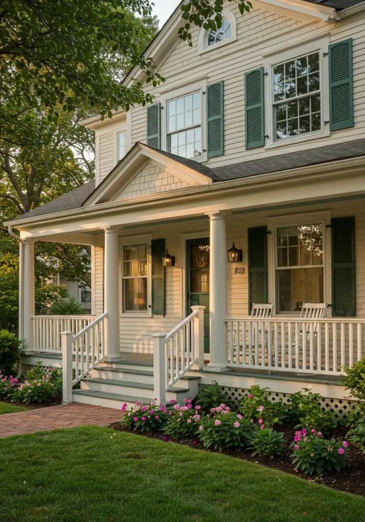 This beautiful Cape Cod home features soft white siding paired with dark green shutters, creating a classic and welcoming look. The charming front porch, with its white railing and classic columns, invites you to sit and relax while enjoying the vibrant flowerbeds filled with colorful blooms. The home’s tall roofline and crisp lines give it a stately appearance, while the surrounding greenery, from the neatly manicured lawn to the climbing plants, adds a refreshing natural touch.