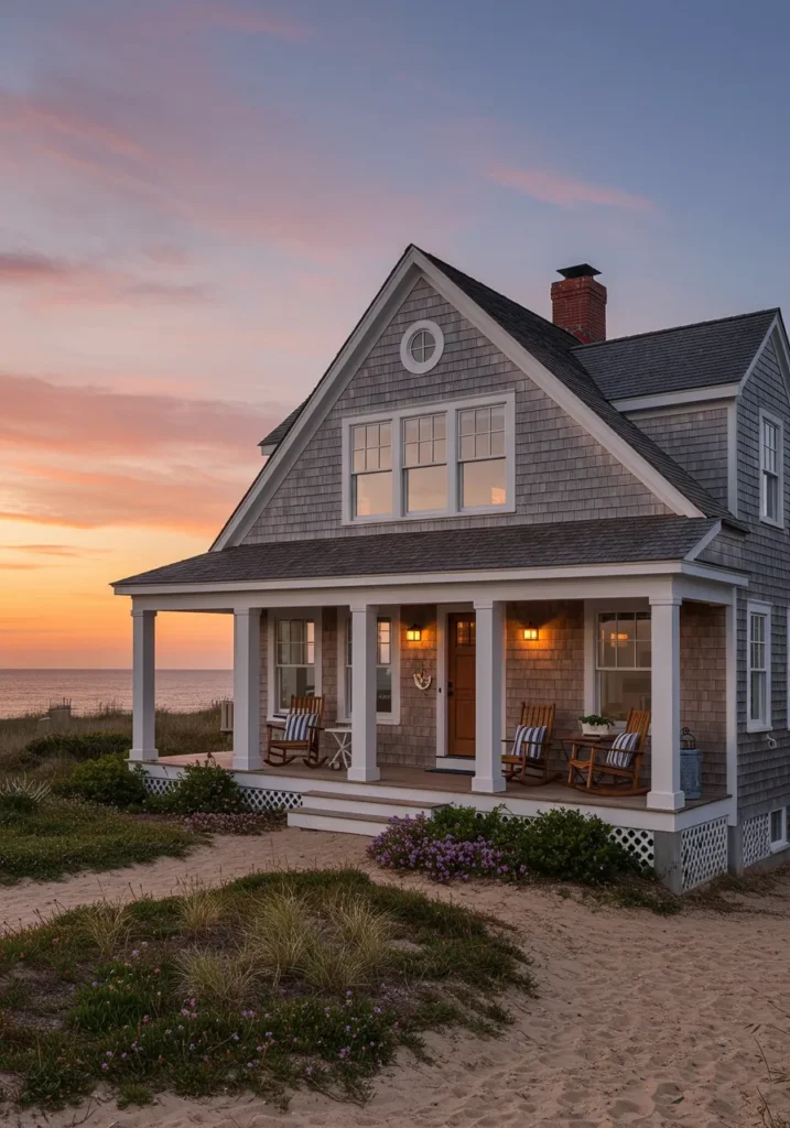 This charming Cape Cod home captures the essence of coastal living, with a warm gray exterior and crisp white trim. The large, open porch welcomes you with its inviting rocking chairs, perfect for enjoying the sea breeze. The bold triangular roof adds an architectural statement, while the spacious windows ensure that natural light floods the interior. The home is nestled in a serene landscape, with the soft sands and greenery surrounding it, offering peaceful views of the beach just steps away.
