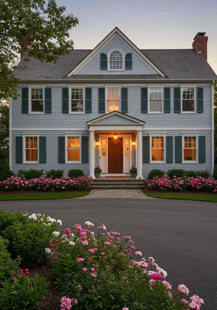 This Cape Cod home is a true example of understated elegance, with its soft blue exterior and classic white trim. The large windows, framed with dark shutters, offer a timeless charm while letting natural light flood the interior. The grand front steps lead to a spacious porch, where welcoming lanterns on either side of the front door light up the entrance. Vibrant flowerbeds with bursts of pink flowers add a cheerful touch, perfectly complementing the serene and inviting atmosphere of the home.