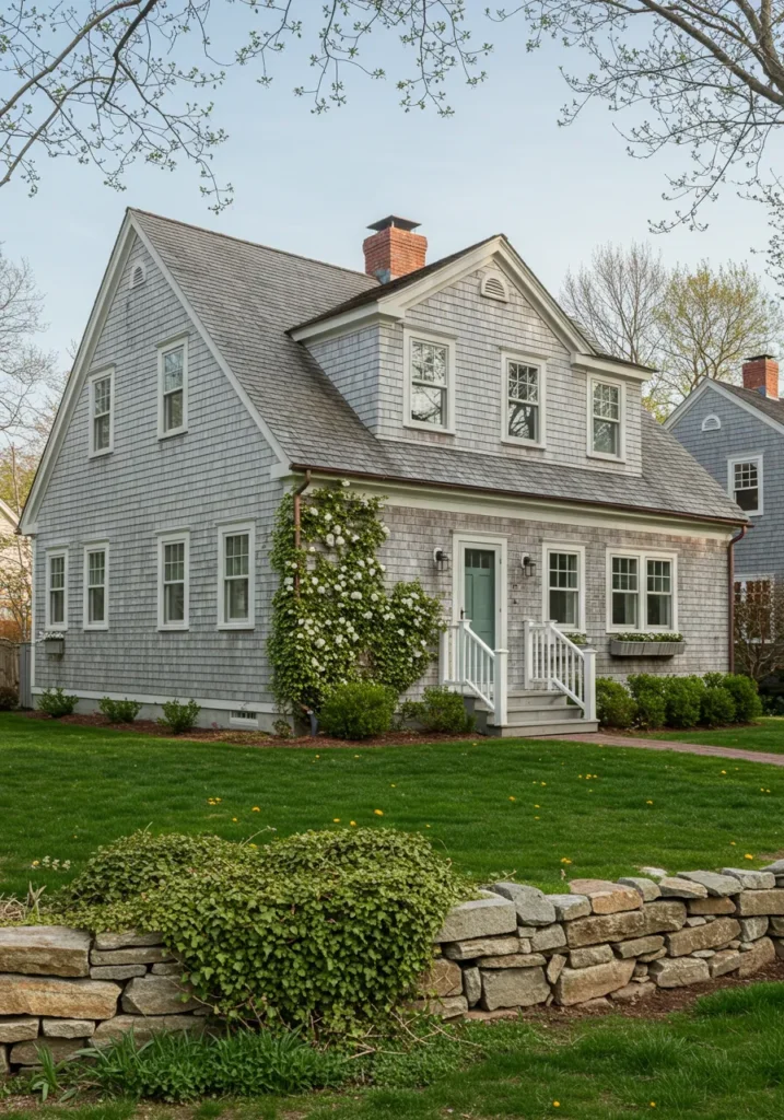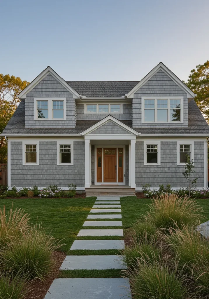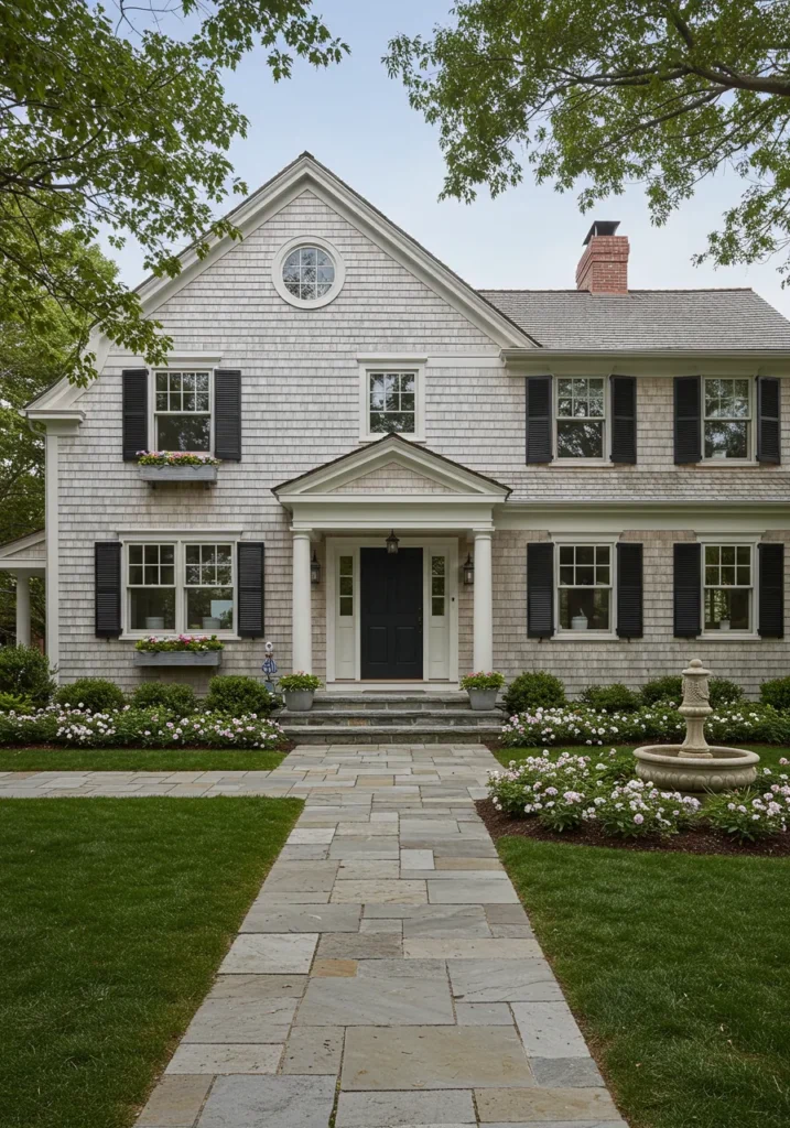 What I love about this design is how it combines timeless elegance with a cozy charm. The soft gray tones of the home create a serene, relaxed atmosphere, while the flower boxes and well-maintained landscaping add pops of life and color. The symmetry and simplicity of the design make it feel grounded, yet the carefully chosen details like the stone pathway and the classic porch give it a sense of sophistication. This home embodies everything that’s great about Cape Cod style—beautiful, practical, and effortlessly inviting!