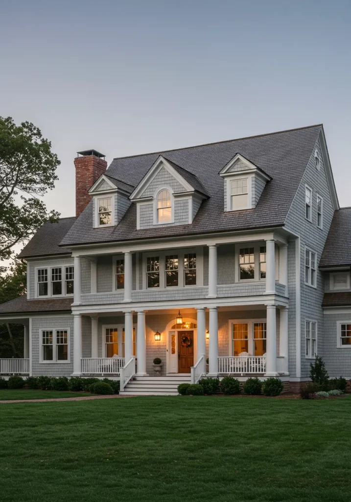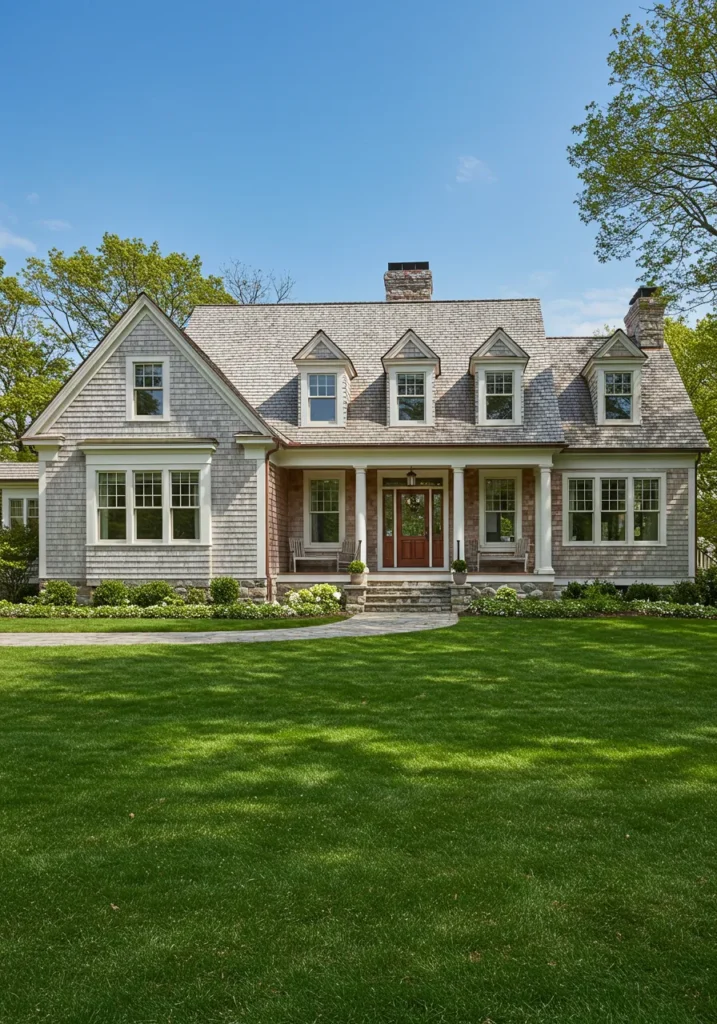 This stunning Cape Cod home boasts a classic yet luxurious look, featuring soft gray shingles and crisp white trim. The grand front porch, supported by elegant columns, creates an inviting entryway. Large, symmetrical windows brighten the space, while the simple, clean lines of the house maintain an effortlessly stylish look. The lush green lawn and well-maintained landscaping surrounding the home further enhance its beauty, making it an ideal example of coastal elegance.