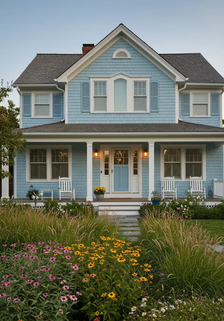 What I love most about this design is the balance between sophistication and warmth. The beautiful blue color with the white trim is both fresh and classic, while the lush flowerbeds add just the right amount of color and life. I can picture myself spending warm evenings on that porch, soaking in the lovely details of the home and its surroundings. It’s a home that feels as though it’s always ready to welcome you, creating the perfect blend of charm and elegance.