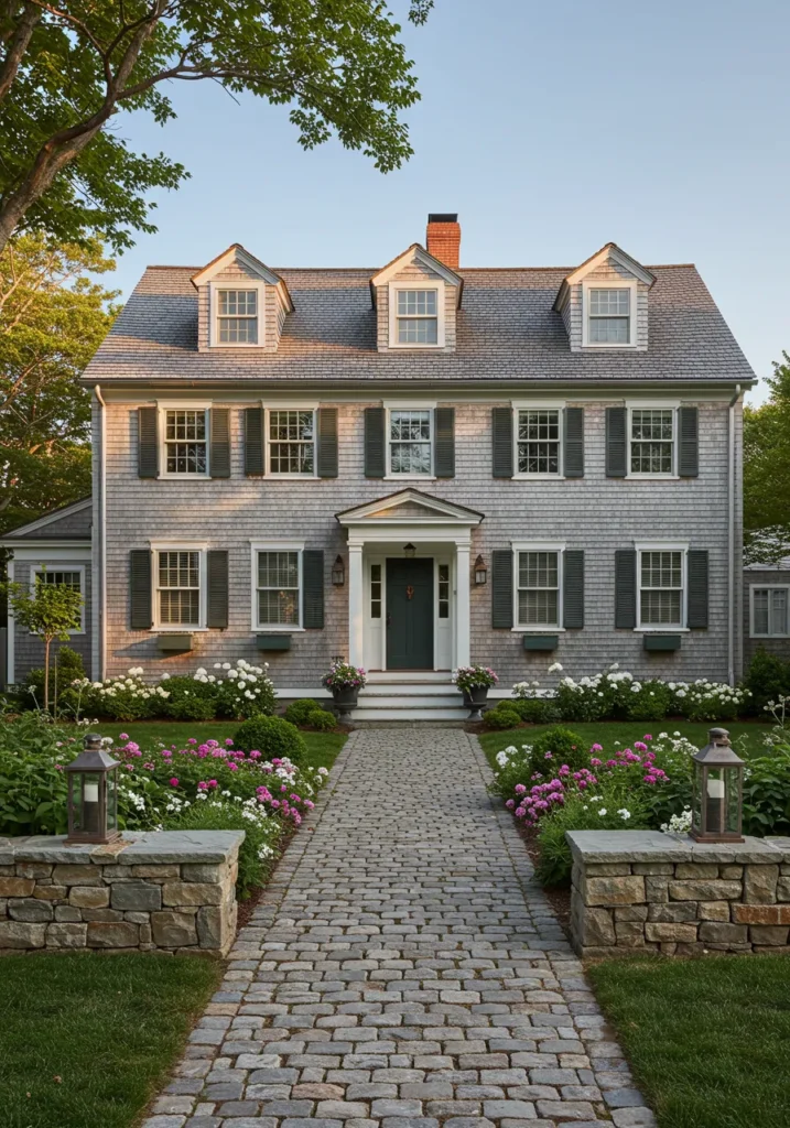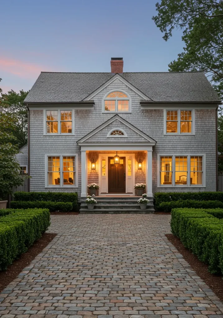 Elegant Cape Cod Home with Cobblestone Pathway