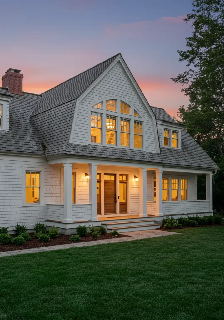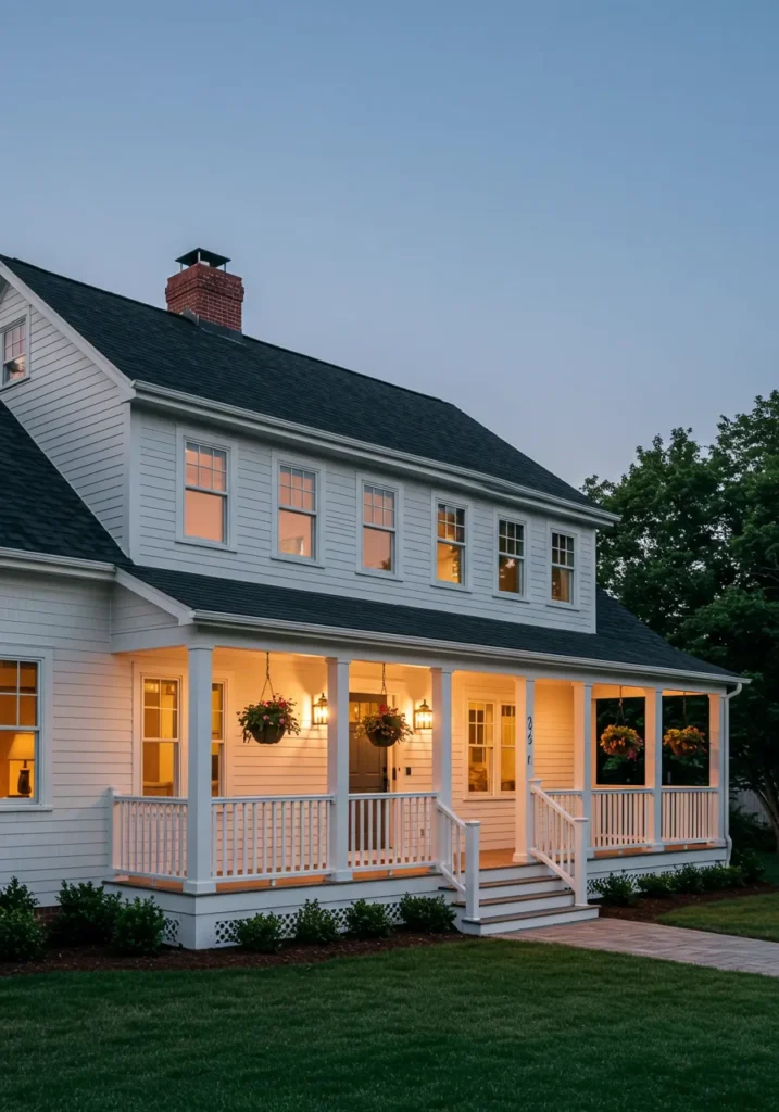 This Cape Cod home exudes classic charm with its crisp white exterior and welcoming porch. The symmetrical design is balanced by a charming front door framed by two large, welcoming lanterns. Above the porch, the simple, clean lines of the roofline highlight the house’s traditional Cape Cod design. Hanging planters bring a pop of color to the otherwise neutral tones, while the well-manicured lawn leads up to the stone walkway, creating a perfect blend of rustic and refined. The warm light spilling from the windows adds a cozy touch, making it feel like the perfect place to unwind at the end of the day.