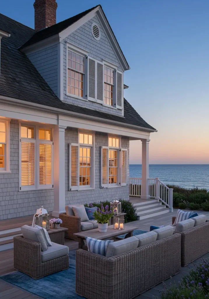 This Cape Cod home effortlessly merges traditional charm with coastal luxury. The exterior showcases classic cedar shingles in soft gray, paired with white trim that makes the home stand out beautifully against the backdrop of the sea. The expansive porch area is the true gem, offering ample space for lounging with comfy wicker furniture. Lush plants and flowers surround the seating area, adding pops of color and life. The large windows with white shutters not only bring in natural light but also offer breathtaking views of the ocean, making this the ideal home for relaxation and entertaining.