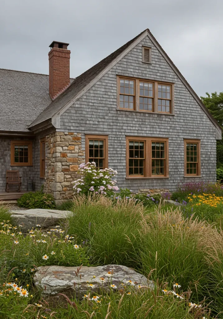 This Cape Cod home is beautifully crafted with a blend of weathered gray shingles and natural stone accents around the front porch, creating a rustic yet refined look. The large windows are framed with light wood trim, allowing ample sunlight to brighten the space. The landscaping features a lush, wildflower-inspired garden with scattered rocks, enhancing the home’s connection to nature. A well-maintained stone path leads to the charming front door, inviting you into this cozy retreat.