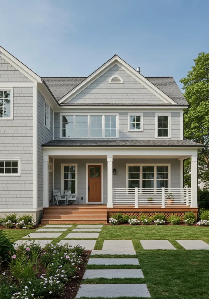 This stunning Cape Cod design features classic shingle-style siding in a soft gray, perfectly complemented by clean white trim. The welcoming front porch is framed by neat landscaping, with large stone steps guiding the way up to a bold wooden front door. The modern railing on the porch adds a contemporary touch, while the abundance of windows ensures the space is light-filled and airy. The landscaping, with its orderly paths and lush greenery, enhances the overall curb appeal, making this home feel both elegant and inviting.