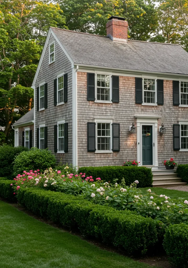 I absolutely adore how this design mixes classic Cape Cod style with a modern touch. The combination of the rich wood tones and the soft gray shingles creates such a peaceful, grounded look. The flower beds and neatly manicured shrubs give it that fresh, welcoming vibe that I can just imagine walking up to after a busy day. This house has that perfect mix of cozy and elegant that makes it feel like a dream home. It’s simple yet sophisticated, and I love the balance it strikes!