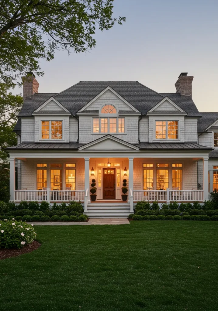 What makes this design so appealing to me is the combination of timeless appeal and modern comfort. The expansive porch just beckons you to sit and enjoy the outdoors, while the large windows provide a bright and airy feel inside. It’s such a welcoming space that feels both luxurious and homely at the same time. The perfect balance of sophistication and charm—it’s the kind of home you can imagine relaxing in after a long day. It truly captures the essence of Cape Cod living!