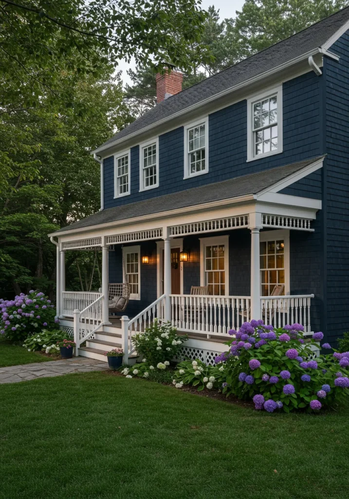 This Cape Cod-style house boasts a striking deep blue exterior, with classic cedar shingles that give it a rich, sophisticated look. The crisp white trim pops against the bold color, creating a beautifully balanced design. A welcoming front porch wraps around the entrance, with two hanging lanterns casting a soft glow on the home’s charming details. The lush hydrangeas in purple and white surround the porch, adding a pop of color that feels both vibrant and serene. This home is nestled perfectly into the greenery, offering both privacy and a sense of connection to nature.