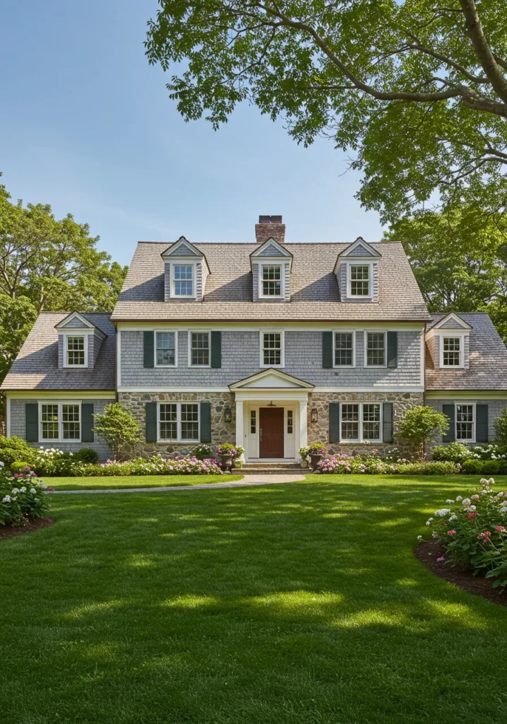 I love how this home feels both grounded and elevated at the same time. The combination of the light cedar shingles with the rich stone details gives it a luxurious yet cozy vibe. The green shutters and colorful flowerbeds bring just the right touch of personality and warmth, making it feel like a place where cherished memories are made. This design is a perfect example of how traditional Cape Cod style can be elevated to something truly breathtaking, balancing elegance with a touch of down-to-earth charm!