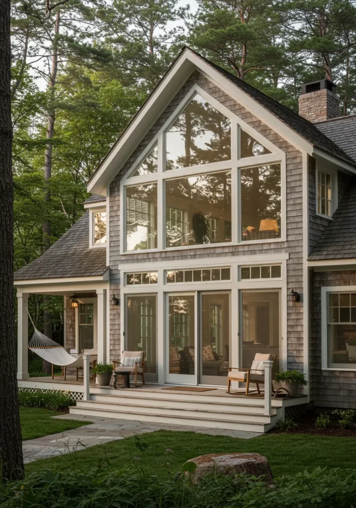 This Cape Cod home takes full advantage of its surrounding nature with a grand, floor-to-ceiling window that offers a stunning view of the wooded landscape. The exterior is beautifully crafted with classic gray cedar shingles and white trim, creating a fresh yet timeless look. The wide porch with its simple design makes a perfect spot for relaxing and enjoying the outdoors. A hammock and inviting seating on the porch add a cozy touch to this beautifully designed home, making it perfect for both quiet evenings and entertaining guests.