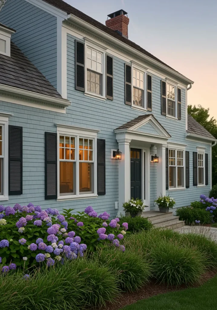 This Cape Cod home features a soft, inviting blue exterior, beautifully complemented by contrasting dark shutters and a stylish front door. The simple elegance of the design is heightened by the well-manicured garden, bursting with vibrant purple hydrangeas that add a playful yet elegant touch. The symmetrical windows and clean lines of the architecture give the home a polished look, while the subtle detailing around the porch and windows adds just the right amount of character. The welcoming front steps lead up to a classic, bright entryway that invites you right in.