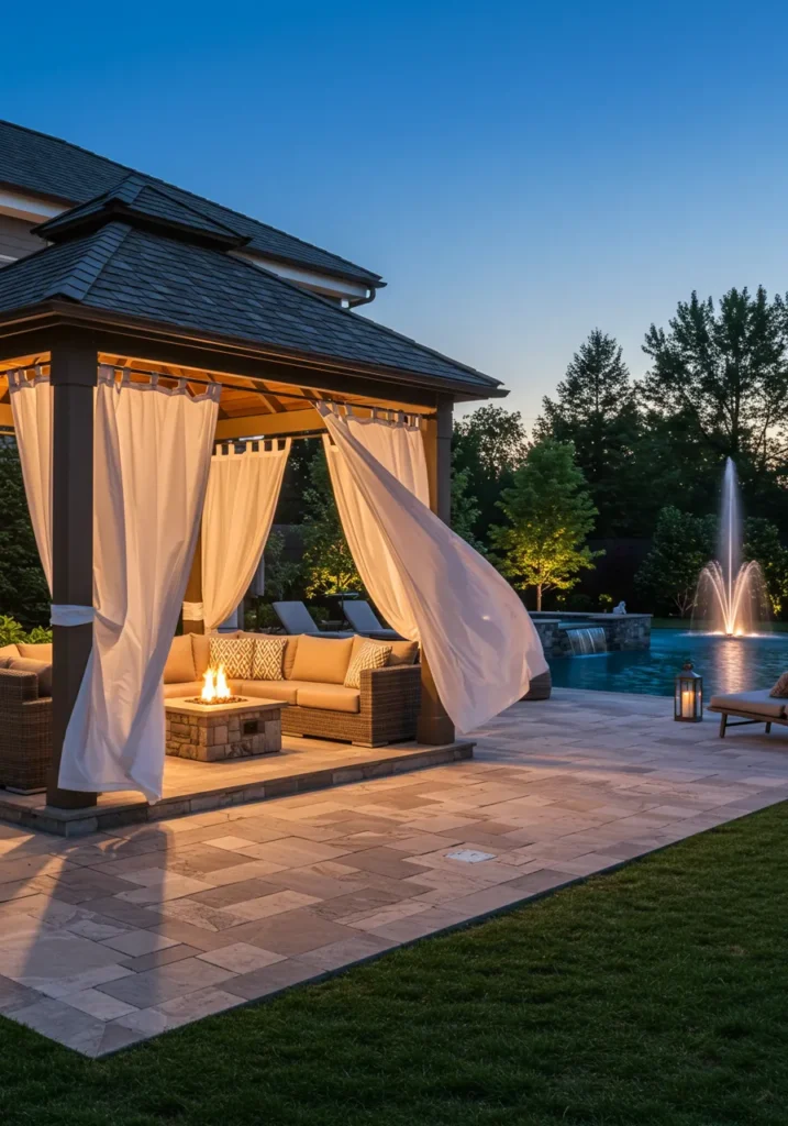 This backyard design is everything you need for those peaceful evenings spent outside. A charming gazebo with flowing white curtains surrounds a cozy outdoor seating area, where a fire pit adds warmth to the space. In the background, a serene water feature gently bubbles away, creating the perfect atmosphere for relaxation. The entire area is meticulously designed with soft lighting to highlight the natural beauty of the space, making it feel inviting no matter the time of day. The clean stone-paved floor and lush greenery further enhance the tranquil vibe.