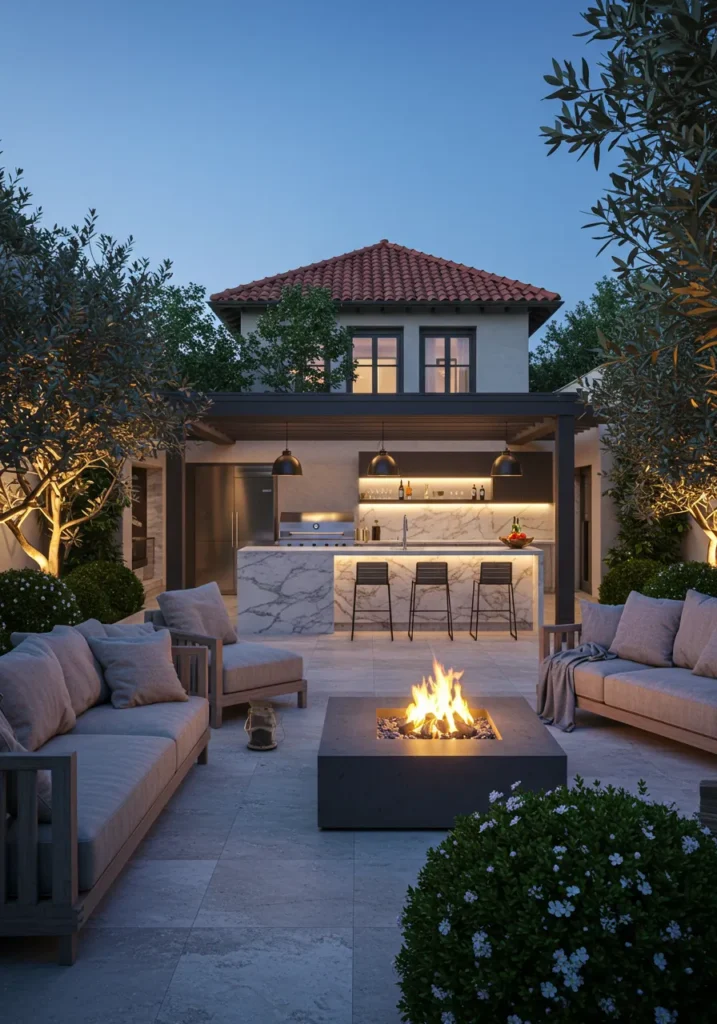 I can totally picture myself hosting a summer dinner party here. The mix of modern materials like marble and the cozy warmth of the fire pit creates such a balanced and inviting atmosphere. Plus, the views are just a bonus! The combination of elegance and practicality makes this design so appealing. It’s an outdoor space that feels chic and comfortable, with everything you need to enjoy a relaxing evening or entertain friends. What’s not to love?