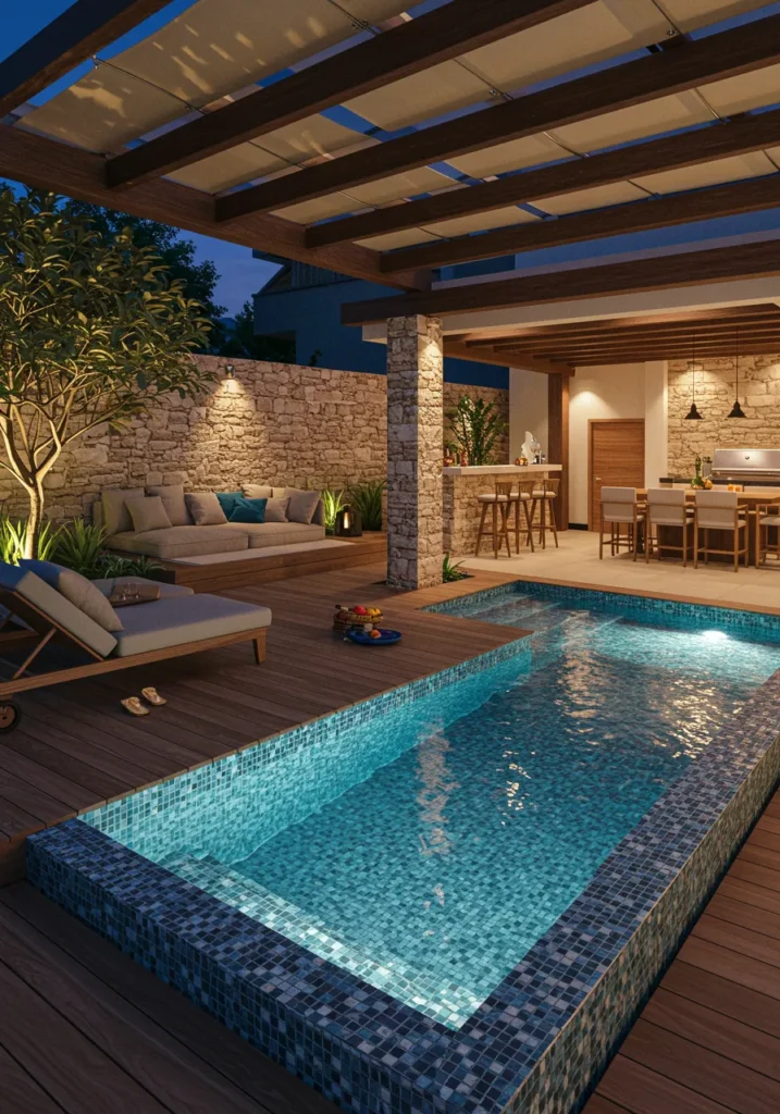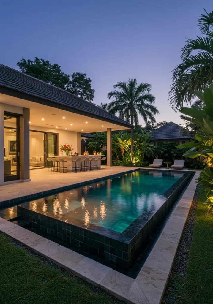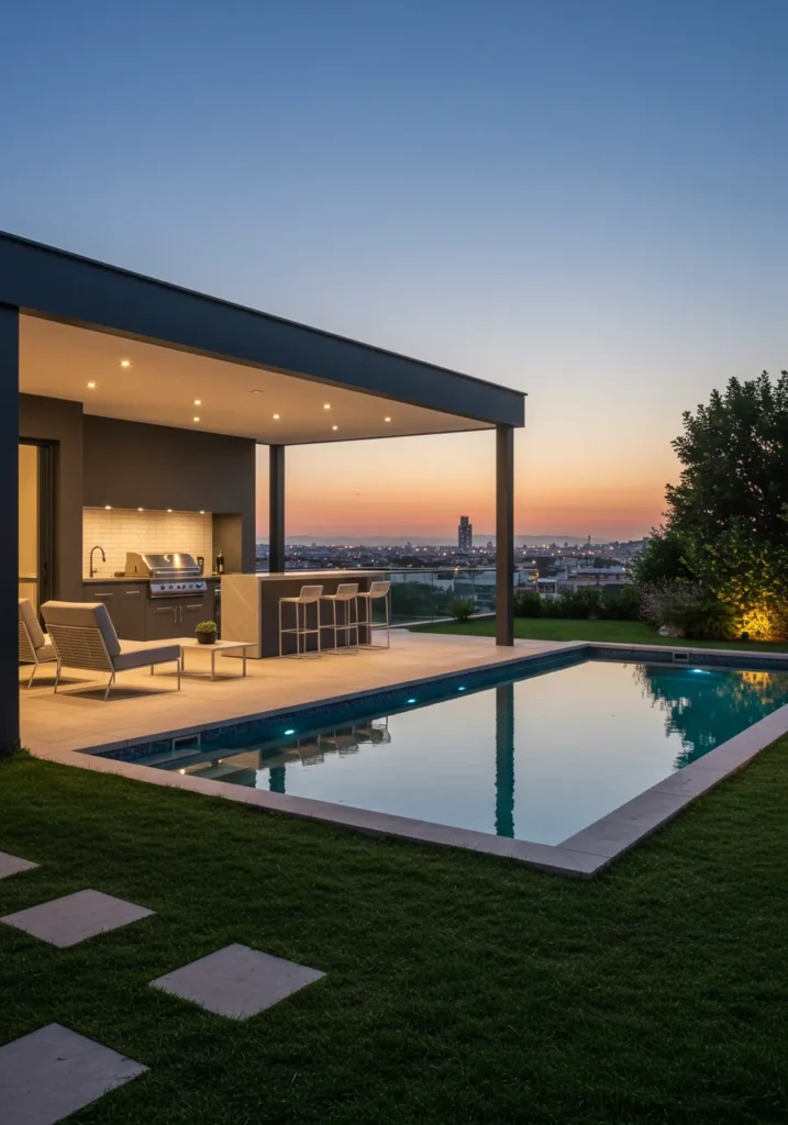 I can’t help but imagine how amazing it would be to entertain friends or unwind here after a long day. The combination of the pool, the outdoor kitchen, and the cozy sitting area makes this space feel like an oasis. I love how everything is thoughtfully arranged for both style and comfort. Plus, the lighting at night? Absolutely magical. I’d love to spend every evening soaking in the atmosphere and enjoying the beauty of this backyard!