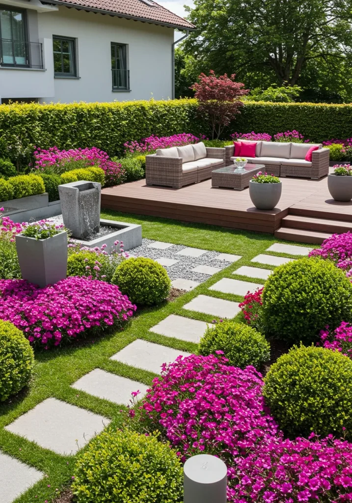 This backyard design showcases a vibrant blend of lush greenery and pops of color, with vibrant pink flowers surrounding neatly trimmed bushes and a stone pathway guiding the way. A cozy seating area sits on a wooden deck, providing a perfect spot to relax and take in the beautiful surroundings. The fountain adds a peaceful touch to the garden, while the surrounding greenery creates a natural, almost secluded feel.