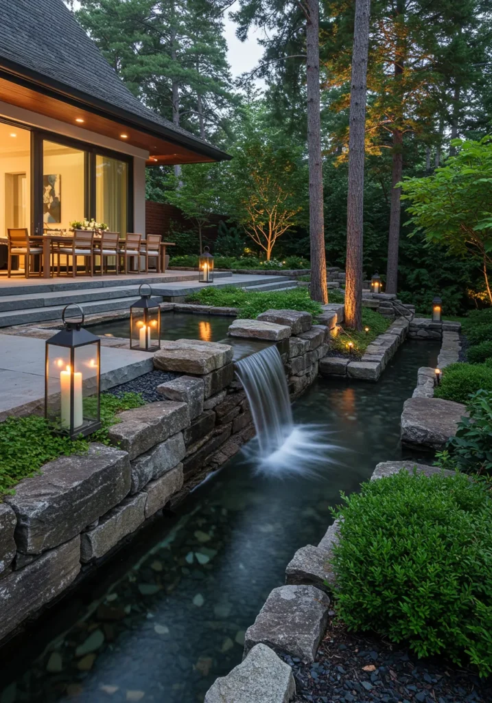 This backyard oasis features a serene water feature, with a gently flowing waterfall nestled within stone-lined pathways. Soft lighting from lanterns illuminates the stonework, enhancing the natural beauty of the surrounding landscape. The minimalist design creates an inviting space with a dining area just steps away from the water, offering the perfect place to entertain or relax while enjoying the calming sounds of the waterfall.