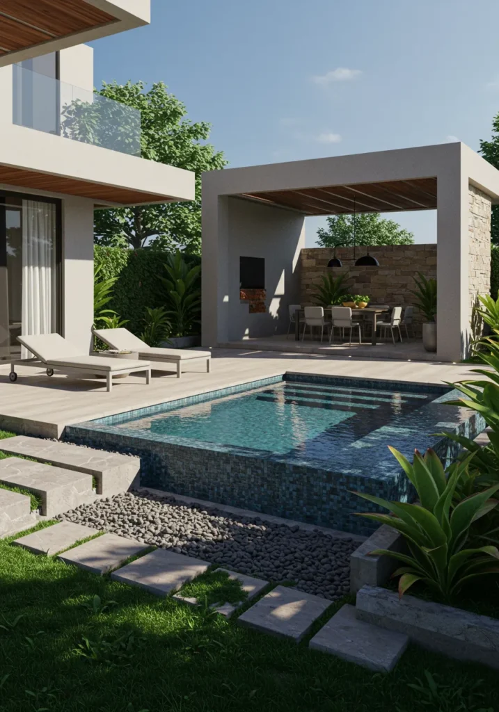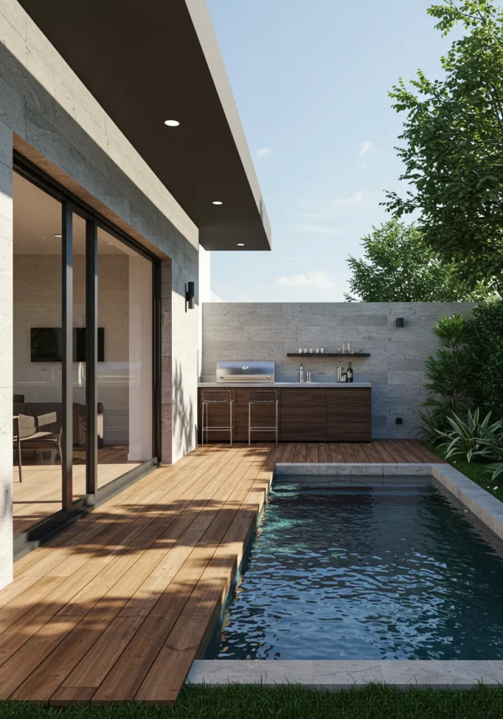This sleek backyard design features a compact yet luxurious pool surrounded by wooden decking, creating a calm and minimalist atmosphere. Adjacent to the pool, there’s an outdoor kitchen area with a modern BBQ setup and clean lines that add to the contemporary feel. The simple yet elegant space is enhanced by a low-maintenance garden that includes some greenery around the area, completing the understated yet sophisticated vibe. This space is ideal for those who appreciate modern design with a functional twist, combining both relaxation and practicality.