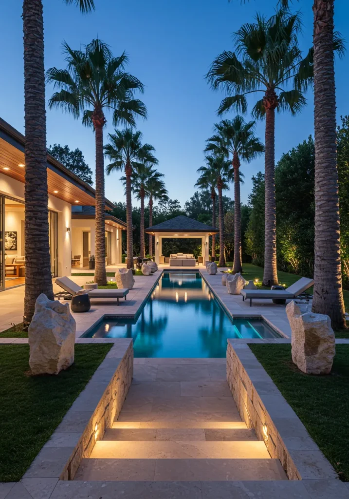 This backyard design radiates modern elegance with its sleek, tranquil pool and carefully curated landscaping. The clean lines of the pool are framed by lush palm trees that gently sway in the breeze, providing a tropical oasis right in your own backyard. The lighting along the poolside steps creates a soft glow that adds a touch of sophistication, while the stone steps leading up to the deck offer an inviting path to a cozy lounging area. The space is balanced by modern furniture pieces and a stunning outdoor pavilion that completes the scene for relaxing or entertaining.