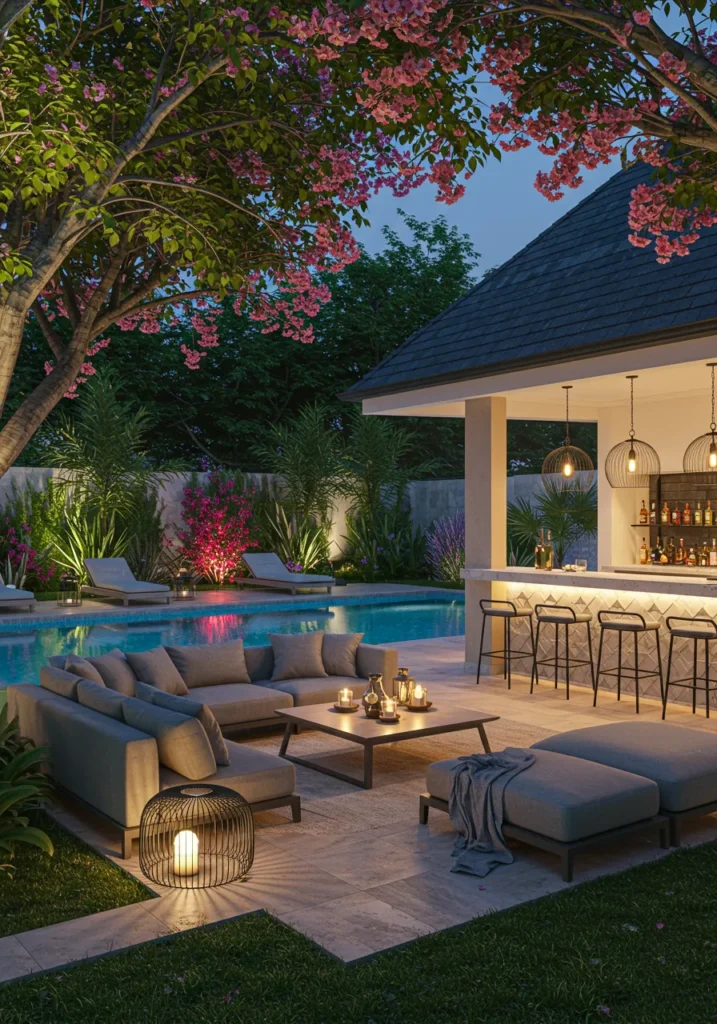 I absolutely love how this design brings together comfort and style in such an effortless way. The vibrant colors from the flowers contrast beautifully with the calm blues of the pool, creating a peaceful yet lively atmosphere. The cozy seating area and sleek bar are just calling for a fun evening with friends or a quiet night with a glass of wine. This backyard design feels like a little slice of paradise – elegant, inviting, and utterly chic!