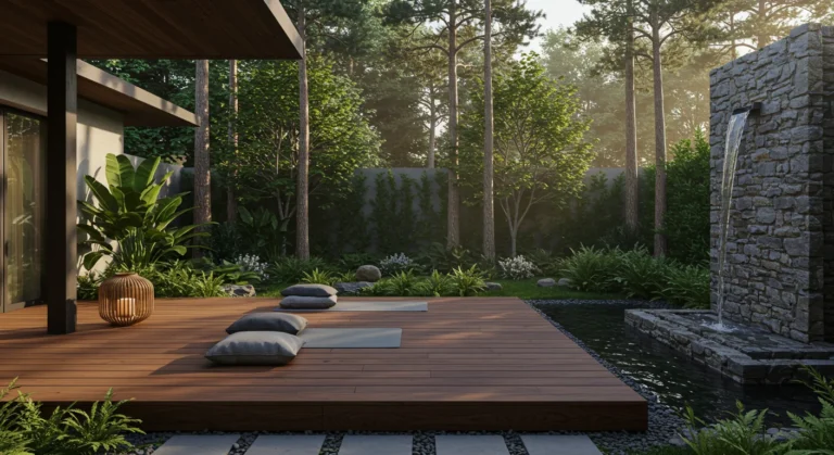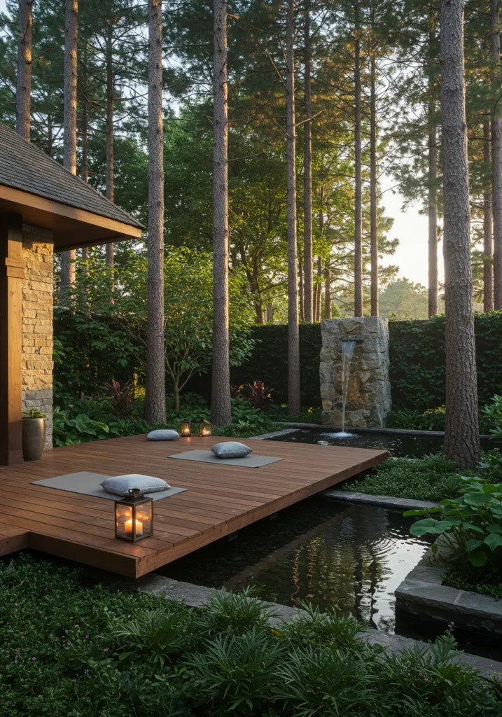 This serene garden space brings peace and tranquility to life with its minimalist design and soothing elements. A wooden deck extends into the lush greenery, where soft cushions are placed, inviting relaxation. The centerpiece is a stunning stone water feature, gently cascading water into a reflective pond, adding a calming touch to the surroundings. Tall, stately trees provide the perfect backdrop, their slender trunks reaching towards the sky. The warm, golden light of lanterns and the tranquil sound of the water create an atmosphere of quiet reflection and harmony.