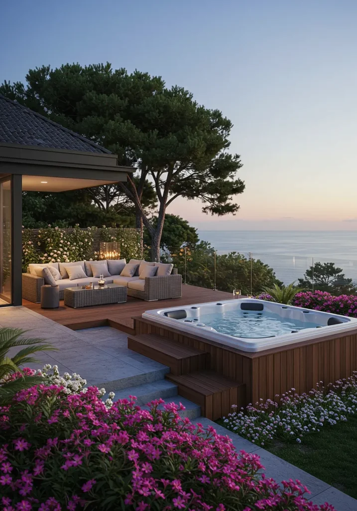 I can’t help but be enchanted by how effortlessly this design blends modern luxury with nature’s beauty. The combination of the hot tub and the ocean view creates a perfect balance of relaxation and style. Plus, the flowers add that extra touch of charm. This is exactly the kind of backyard where you can unwind in luxury, and honestly, I could spend hours just gazing out at the view while sipping my favorite drink. It’s truly a space that makes you feel like you’re on a never-ending vacation.