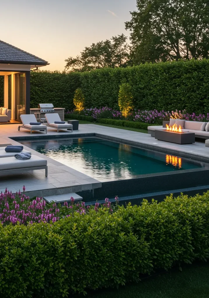I absolutely love this design because it seamlessly blends relaxation and luxury in such an effortless way. The fire pit next to the pool creates the most calming vibe, and the simple yet elegant greenery brings a soft touch of nature to the space. There’s something about the clean lines and the gentle glow of the lights that just makes this place feel like the ultimate retreat. If you love modern style with a cozy twist, this setup feels like the perfect place to relax, entertain, or just enjoy a peaceful evening. It’s luxurious without feeling overly flashy – just the right balance.