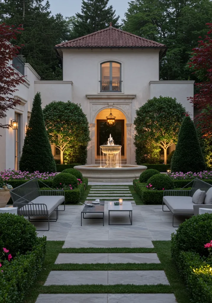 I can’t help but be in awe of how refined this design feels. The symmetry and the fountain bring such a classical vibe, almost like stepping into an art gallery or historical villa. The sculptures are a beautiful addition, making it feel like a personal sanctuary. Honestly, I could easily imagine hosting a small gathering here or just spending time soaking up the peace and beauty. It’s the kind of space that feels luxurious but still so inviting. Just perfection!
